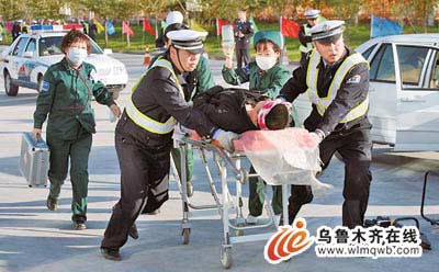 交警和120急救人員展開現(xiàn)場急救運(yùn)送“傷者”。