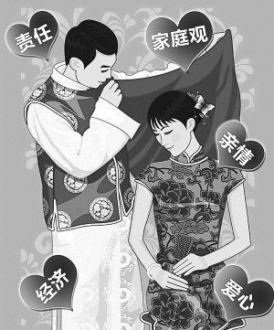 “結婚生子、白頭偕老的婚姻觀依然占主導地位。”徐安琪說,65.6%的人贊同“不管怎么說,人總是要結婚的”,反對的為15.2%;72%的受訪者贊成“婚姻是神圣的,結了婚就要白頭到老”,不贊同的僅為6.7%。此外,84.4%的人反對“結婚后不要孩子”,對“丁克”家庭持肯定態度的僅占1.6%。