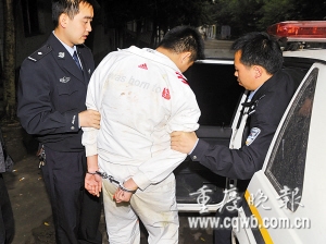 至昨下午4時許,南岸警方結(jié)束對被抓獲男子的突審,移交南川警方。男子身穿一套白色運動服,脖戴1條很粗的金項鏈。(首席記者 黃艷春/文 記者 冉文/攝 郭娟/制圖)