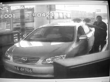 14時57分,該男子拿出一個證件模樣的東西給收費人員亮了亮,然后進入車內(nèi)。