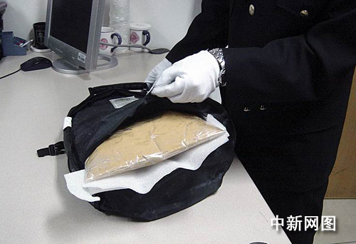 旅檢現場關員從雙肩背包的夾層里發現了1253克的毒品海洛因。