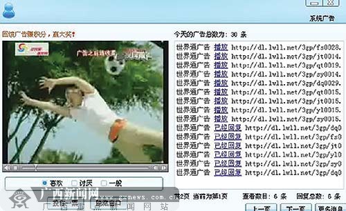 記者通過(guò)QQ向河南鄭州的一名叫“歐陽(yáng)星空”的資深“世界通”代理商咨詢,他稱“世界通”與各大公司都簽有協(xié)定,才獲準(zhǔn)播出相關(guān)公司的廣告!笆澜缤ā钡膹V告也宣稱,“我們給用戶的獎(jiǎng)勵(lì)回饋是由發(fā)布廣告和信息的企業(yè)支付的”。