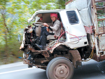 “我當時都嚇慘了,正當目瞪口呆的時候,駕駛員竟然還對著我們車上的乘客笑,坐在副駕駛的女子也若無其事。”陳說,當時貨車開得很快,車身搖晃不已,里面的零件都像要飛出來了,駕駛員隨時都有可能從車里滾到公路上。客車超過貨車之后,在其前面停下,陳先生等人攔下貨車。據“腦殘車”駕駛員介紹,他駕駛的長安貨車與一輛大貨車相撞,由于貨車“沒有受到大的損壞”,還可以繼續行駛,他便將車開回家。