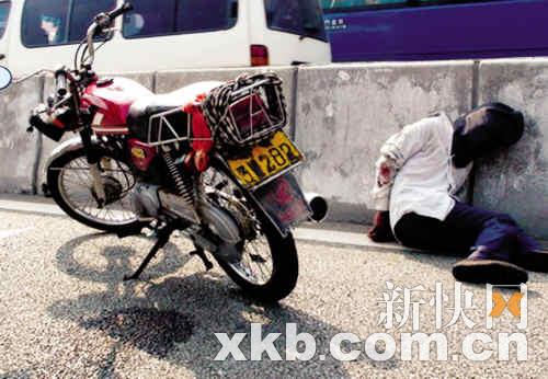 劫匪駕車高速轉入南海大道時,與路過的車輛發生碰撞失控倒地,劫匪欲翻越護欄逃跑時被民警阿偉抓獲。