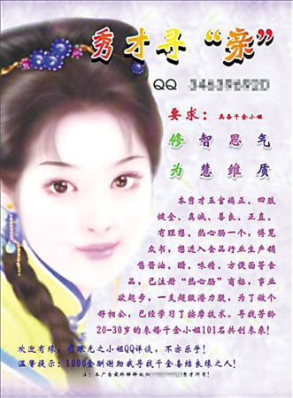 昨日,記者在楊家坪楊馨酒店外的廣告宣傳欄上看到這則由A4紙打印的征婚廣告,上面還有一張古典裝扮的美女圖。廣告上寫到:“本秀才五官端正,四肢健全,真誠,善良,正直,有理想……目前有形資產(chǎn)6位數(shù),無形資產(chǎn)9位數(shù),未來的億萬富翁,慈善家……尋找芳齡20~30歲,電視連續(xù)劇《上海灘》里馮程程類型的未婚千金小姐101名共創(chuàng)未來!(1名共創(chuàng)家庭,100名共創(chuàng)事業(yè))”廣告上,除了一個(gè)QQ號(hào)碼外,沒有留下其他任何聯(lián)系方式。