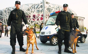 目前,奧運中心區共有30名民警和60名保安員負責巡邏,每天還從巡邏隊調用兩只警犬。而隊里除了有20多輛電動自行車、7輛普通警用電瓶車以外,還有2輛帶警犬籠的警用電瓶車,這在全市是獨一無二的。記者看到,這種電瓶車的后座上安裝著方方正正的警犬籠,平時民警駕駛電瓶車巡邏,警犬就趴在犬籠里跟著轉悠,車停下以后,民警再牽著警犬步行巡邏。而身穿作訓服的巡警牽著威風凜凜的德國黑貝警犬,也成為奧運中心區里一道獨特的“風景線”,很多游客都爭相與他們合影。