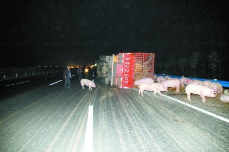 拉豬車側(cè)翻,30多頭豬撒歡兒高速路