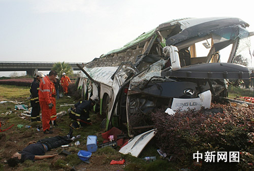當天上午7時40分,第一批消防救援隊員趕到事故現場。此時,現場圍滿了群眾,呼聲、喊聲不斷,大客車則是面目全非,車頂和車身已經有15度的傾斜,車頭嚴重變形,車身車窗玻璃盡碎。