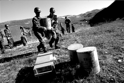 技術(shù)人員將車上的炸藥卸到指定地點。記者董世彪攝