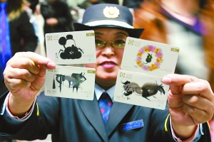 由著名藝術家韓美林設計的北京地鐵首套紀念文化卡票票冊,周六開始在除機場線外的7條地鐵線路各站發售。地鐵公司表示,本次發行的單程文化卡票,可于2008年12月6日到2009年3月1日前任意在地鐵運營各線(機場線除外),各站當日使用一次,卡票在出站插卡后,閘機會自動“吐出”紀念卡票,不影響乘客收藏。(記者 韓萌 左林 攝影)