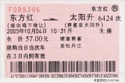 “東方紅”站位于現在虎林市與饒河縣之間的密東鐵路的盡頭站,而車票中顯示的“太陽升”站,是位于黑龍江省大慶市大同區太陽升鎮的“太陽升”火車站。這張2005年的車票顯示,由“東方紅”至“太陽升”需要經過多次轉車,而售出這張車票的是“東方紅”火車站。水妖昨日打電話詢問該站工作人員得知,票上的“雞下哈讓”分別代表4個中轉地:雞西、下城子、哈爾濱、讓湖路。這樣的車票現在還可以買到,不過當年的車次已經改變,現在這條路線的車次應該是6224次。