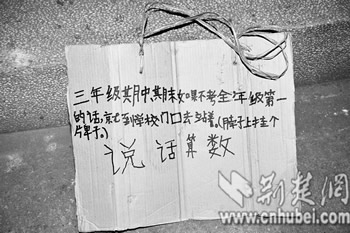 在桌子上,記者看到一塊黃色紙牌,上面寫著:“三年級期中、期末如果不考全年級第一的話,就到學校門口去站著。”(如圖)。