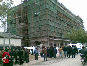 位于奉賢區金匯鎮金錢公路2225號的一在建6層樓房坍塌,8名工人被埋。(圖片來源:東方網)