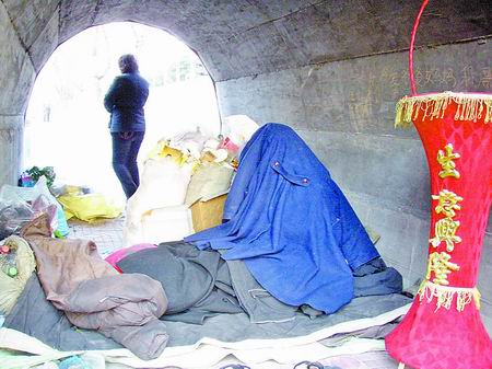 下午4時許,在公園內一座水泥橋下的橋洞內,記者看到一些舊報紙、塑料瓶等,旁邊放著一個小鐵鍋。地上躺著一名男子,身上蓋著舊呢子大衣,正呼呼大睡。