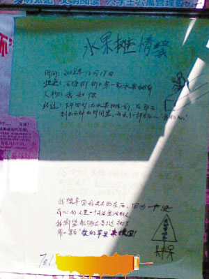 “太強(qiáng)悍了,圣誕節(jié)愛情宣言竟然貼到了我們女生宿舍的宣傳欄上!”江南大學(xué)一名女大學(xué)生向記者報(bào)料稱,該校北區(qū)女生宿舍樓下的宣傳欄里出現(xiàn)了一張張名為“水果攤情緣”的“很強(qiáng)大”的求愛海報(bào)。
