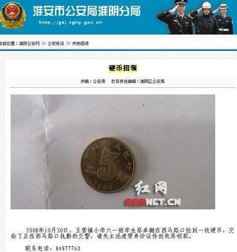 這則5毛錢招領告示系江蘇省淮安市淮陰公安分局所發。啟示稱,“王營鎮小學六一班學生蔡卓樾在西馬路口撿到一枚硬幣,交給了正在西馬路口執勤的交警,請失主迅速帶身份證件到我局領取”。啟示上還附有照片,一枚銹跡斑斑的5毛錢硬幣,靜靜躺在照片里。據悉,這是他們根據上級的要求,作為政府信息公開的具體實施步驟,通過互聯網發布失物招領信息。記者搜索到5毛錢硬幣頁面已被刪除。不過,能通過“快照”看到。