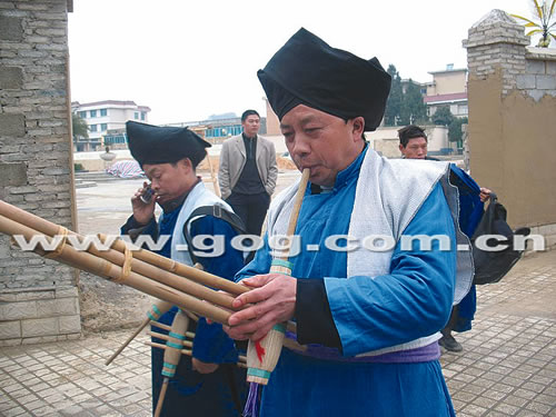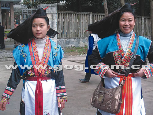 記者看見,穿戴盛裝的男子們均身穿青藍(lán)色的長衫,外加一件白色的小褂。據(jù)稱,這件小褂名為旗幟褂,上面還繡有夜郎王印,穿戴旗幟褂,這與祖先們打仗有關(guān),他們頭上戴的用黑布包裹的帽子有五個角,看上去讓人頓生威嚴(yán)之感(如圖);而夜郎美女們穿戴的是一套漂亮的有各種色調(diào)的衣裙,據(jù)她們說,這叫七江裙,上面記錄有他們的祖先約3000多年前遷徙的歷史。而最令人注目的,還是這些夜郎美女們的發(fā)型。只見她們的頭上均插了一根約兩尺長的竹片,長長的頭發(fā)繞著竹片使頭發(fā)在右側(cè)成了一個半弧形(如圖)。她們告訴記者,這種發(fā)型也是竹王崇拜的一種。