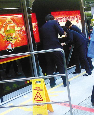 記者隨后在農講所地鐵站臺看到,破裂的是第14和15道門。由于工作人員反應較快,地面破碎的玻璃片已清理得一干二凈,地鐵也恢復正常通車。破碎玻璃墻外被鐵欄桿牢牢圍住,以防止因乘客擁擠而掉入地鐵軌道。兩扇出入地鐵列車的門已被封閉,禁止乘客出入。欄桿旁邊有工作人員在為落站的乘客指引乘車路線。