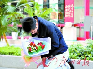 寒風(fēng)瑟瑟,一年輕男子跪在東莞市南城區(qū)體育路口,從早上9時到下午4時,遲遲不肯起身。他的懷中抱著一束紅色的玫瑰花,他不時用右手撐一下地面,讓自己發(fā)麻的膝蓋放松一下。