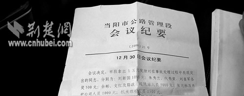 遺體火化當(dāng)日,當(dāng)陽市公路段召開月度工作會,以紅頭文件印發(fā)的《會議紀(jì)要》決定:拿出一萬元獎勵在事故處理過程中“表現(xiàn)突出”的同志,分別為:劉某1000元;朱某、代某、劉某各500元;余某、文某及路政、超限站人員5000元;張某及養(yǎng)護(hù)公司人員1000元;機(jī)關(guān)維穩(wěn)人員1500元。