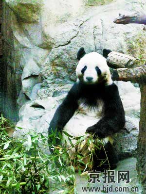 今天上午,記者在北京動物園熊貓館室內(nèi)展廳看到了“古古”,它正悠閑地坐在樹邊啃著竹子。竹子啃到一半,它的耳朵突然立了起來,一轉(zhuǎn)頭,只見一名飼養(yǎng)員站在它的小柵欄門外。“古古”晃晃悠悠地爬了過去,像人一樣站直身子等著飼養(yǎng)員喂食,領(lǐng)到“零嘴”后便一口吞了。飼養(yǎng)員離開后,“古古”卻依然直立著身子握著欄桿等著。