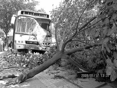 一位目擊者告訴記者,車禍發生后,36路車是與同方向開行的66路車發生追尾撞的,66路車“傷情”較輕,已經被交通拯救車拖走。而36路連續發生碰撞后,被卡在裸露在人行道上的樹根上,再加上該肇事車駕駛室嚴重損壞,善后處理工作難度較大,需要時間吊轉。
