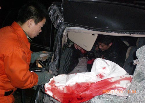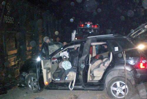 凌晨3時(shí)14分,接到報(bào)警后,漯河源匯區(qū)消防大隊(duì)特勤中隊(duì)中隊(duì)長(zhǎng)彭中明立刻帶領(lǐng)一部搶險(xiǎn)救援車10余名隊(duì)員火速趕往事故現(xiàn)場(chǎng)。距離現(xiàn)場(chǎng)50米外,就能看到一列長(zhǎng)長(zhǎng)的火車停在南環(huán)路中間,把進(jìn)入漯河市區(qū)內(nèi)的幾條主要通道牢牢堵死,造成進(jìn)出漯河的幾輛汽車無法通行。來到事故現(xiàn)場(chǎng),只見一輛小轎車的車頭被撞得面目全非,擋風(fēng)玻璃被撞碎,車前的引擎蓋被撞得凸了出來,一名40多歲的司機(jī)滿臉是血,嘴里不停地發(fā)出微弱的呻吟聲。由于他的雙腳被卡在變形的車體內(nèi),現(xiàn)場(chǎng)的交警經(jīng)過多次努力最終沒能將其救出。