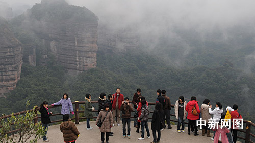 中新網韶關1月31日電(馮昶 劉加青 李正紅)從大年初五起,由于天氣轉好,廣東韶關市丹霞山風景區出現美麗的云海景觀,吸引眾多游客觀賞,景區接待持繼升溫。據統計,昨日共接待游客近2.6萬人次。自助自駕游游客劇增,同比增長一倍半以上,其中有不少來自四川災區的民眾。