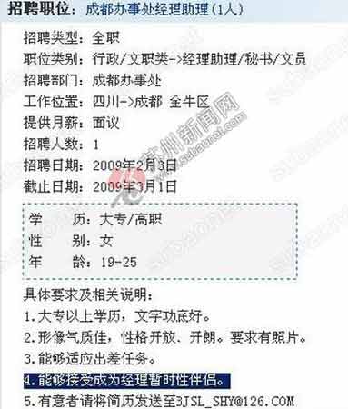 2月3日下午,成都招聘網(wǎng)上一條招聘信息讓網(wǎng)友驚詫不已,這是北京某科技公司成都辦事處招聘一名經(jīng)理助理,要求女性,大專、高職即可,年齡在19至25歲,以及其他一些常規(guī)招聘要求。隨后在“具體要求和相關(guān)說明”一欄中,有兩條要求別出心裁,是眾多求職網(wǎng)友從沒見過的。第二條:形象氣質(zhì)佳,性格開放、開朗。要求有照片;第四條:能夠接受成為經(jīng)理暫時性伴侶。招聘信息中還留有招聘單位的聯(lián)系人、電話和郵箱。