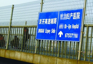 時先生所指的指路牌有四塊。其中一塊懸掛在新發地長途客運站門前的過街天橋南側護欄上,正下方為進京方向輔路。這塊藍底白字的牌子上,并排印著京開高速輔路和某家婦產醫院的字樣,旁邊還有相應的英文和箭頭指明方向,并留有醫院電話。