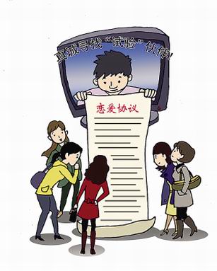 姜楠傳給記者一份詳細的《戀愛協議》,內容包括甲乙雙方應履行的義務、責任共三大款13小條。《協議》要求,雙方以合租的方式同住一屋檐下,但互不侵犯,經濟采用AA制。甲乙雙方必須做到忠誠不二、一心一意、體貼關愛,處處為對方著想,同時互不干涉彼此自由生活。