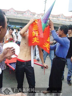 兩位新人的老鄉趙先生參與策劃了這次接親活動。“這樣惡搞其實就是圖個熱鬧!”趙先生告訴記者,在老家邵陽,每家人迎親時都要大鬧一番,形式不限,花樣翻新,越熱鬧越好,“有句話叫‘結婚三日無大小’,說的便是結婚那幾天不必計較輩分,誰都可以拿來惡搞。因此,新郎的父親也被拉進迎親隊伍,甚至遭到‘鞭打’。而新郎在迎親當天一定要吃夠苦頭,有車不能坐,要拉著新娘走,被鞭打更是家常便飯”。
