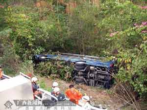 當天上午9時40分,一輛快巴趕到事故現場,接送未受傷的17名乘客到南寧,而兩名司機在現場配合交警調查。 (記者 苑長軍)