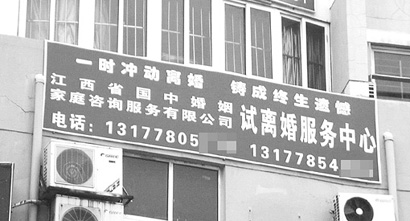 “一時沖動離婚,鑄成終生遺憾。”近日,江西省南昌市北京東路京城大廈外墻懸掛的一塊大型廣告牌,吸引了過往市民的注意。做廣告的不是婚姻調解機構,而是一家“試離婚”服務中心。