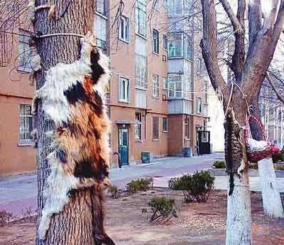 近日,在天涯、華商網(wǎng)等各大論壇都可看到這樣一個帖子——《慘無人道,殺死流浪貓吃肉后還剝皮綁在樹上》。點(diǎn)擊進(jìn)去可以看到,在某小區(qū)一戶人家門前的樹上,兩張貓皮一左一右被綁在那里,繩子分別從嘴部和尾部勒過。