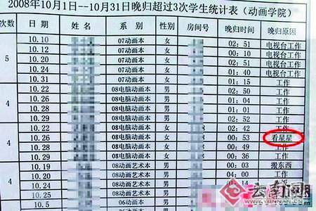 昨天,各大網(wǎng)站紛紛亮出北京電影學院的一份晚歸統(tǒng)計名單,在這張表格上,某位女生因為在晚回宿舍原因一欄中填寫了“看星星”,而被網(wǎng)友評為最雷人理由。