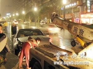 前日晚,江北歐式一條街,一輛價值60萬元的尼桑豪華跑車,撞上了路燈電桿,車頭被撞得四分五裂。事后,駕駛員遲遲不露面,站在不遠處旁觀,在交警的多次盤問下才站了出來。