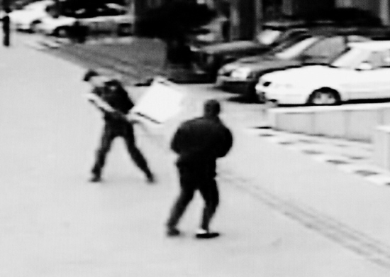 昨天上午9點40分左右,文三路與教工路口東南角的立元大廈,10多名身著保安制服的人,與3名男子在北門口起了激烈沖突。