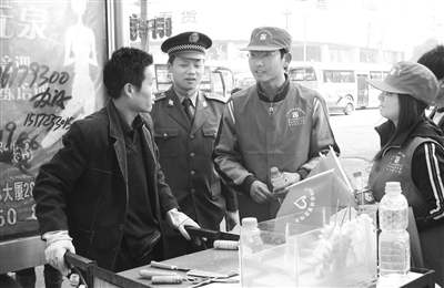 昨日首次“上崗”2小時,這群大學(xué)生“城管”共勸阻占道經(jīng)營、流動攤販17處,清除“三亂”牛皮癬34處。(記者 夏瓊 通訊員 葉火生 李梅)(記者 蔡曉智 通訊員 李梅 攝)