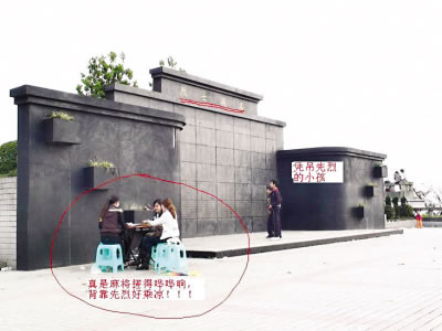 天涯網友“surperdry1”稱,15日那天,春光明媚,他帶上全家人到位于江津艾坪山的烈士陵園里面緬懷先烈。進入陵園卻發現麻將聲聲,雞鳴不已,并配發大量照片以證實自己的話。此帖一出,立即引來網上熱議。烈士陵園怎能受到如此待遇?“surperdry1”還說,盡管草坪上有石碑警示路人“請您尊重安息在陵園內的革命英烈,用文明的言行維護陵園的莊嚴肅穆”,但游人仍然我行我素。