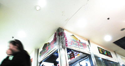 昨日中午,記者在現場發現,其主要通道和許多門市的墻面上開始清晰地出現大小不一的裂縫!案杏X像每天都在經歷地震。”大坪金象世家地下商場C區105號商戶趙庭明指著頭頂附近的一條裂縫說,前天上午,巨響突然傳來,一位恰巧經過的老太以為發生地震嚇得當即蹲倒在地。