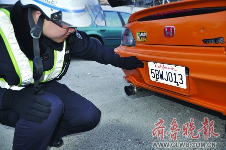 17日下午,煙臺市交警一大隊交警在南大街路段巡查時,查住一輛雷人的老款本田轎跑車,該車車牌寫的全是外文。據駕駛員本人講,這副車牌是美國加利福尼亞州的車牌,他覺得洋車牌新鮮、氣派,便找別人弄到一副作廢的掛上了。交警表示,這種做法顯然是違法的,車主將面臨處罰。(記者 張琪 通訊員 趙亞林 溫全福 攝)