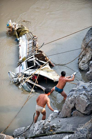 除搜救外,打撈事故車輛殘骸是昨日的重點工作之一。記者了解到,前日上午,當地政府組織了80余人趕到事故現場,請當地船工找到事故車輛的位置,用繩索固定,用吊葫蘆拉,但因貨車被大石卡住,只好聯系一輛25噸的吊車來打撈。
