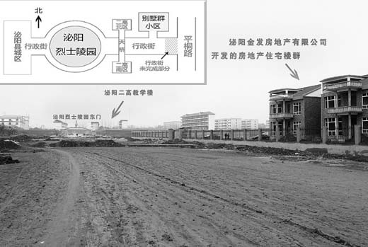 從空間位置上看,由金發房地產開發公司所建的住宅樓在烈士陵園東側約1公里的地方,中間間隔了泌陽縣第二高中校園。住宅樓及別墅區并沒有侵占烈士陵園土地。