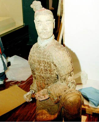 據陜西歷史博物館館長成建正介紹,這件綠面跪射俑即使在兵馬俑博物館也僅展出過一次,平時都是用布將兵馬俑包裹起來的。該俑是考古隊在1999年9月10日在二號坑發現的。整個兵馬俑身上都施以彩繪,尤其是面部彩繪完整,白色眼白,黑色瞳孔,雙眼炯炯有神。不同于其他陶俑的淡粉面色,淡綠面色尤其引人注目。該俑的出土,引起了文物專家的爭論,誰也不能確定為什么這尊俑的面部要施以綠色顏料,甚至有人猜測“綠面”有可能是工匠們的惡作劇。