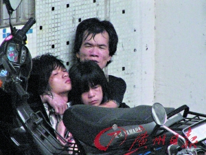 當(dāng)三輪摩托車開到城東派出所門前,杜某民嫌車速太慢,叫司機(jī)開摩托車進(jìn)入城東派出所院內(nèi)。下車后,杜某民用小刀架在小李的脖子上,用手扣住小袁的脖子(見圖),大聲叫喊:“有人殺人了,快報(bào)案”,然后把小李、小袁兩人推到城東派出所飯?zhí)靡唤锹洌纸校骸鞍阉泄捕冀谐鰜怼!?/p>