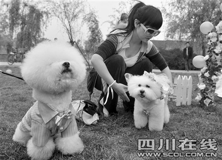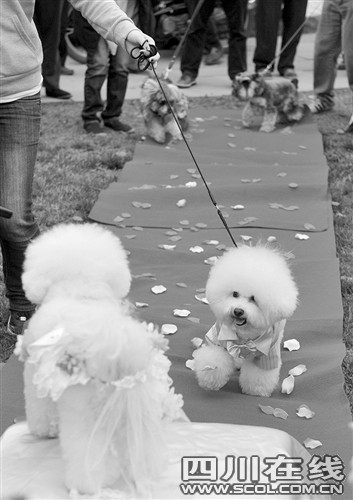 昨天下午3點,成都非物質文化遺產國家公園內響起了結婚進行曲,正當市民們駐足想看下新人的模樣時,兩只白色的比熊犬身穿鮮艷禮服走上紅地毯,突然闖進大家的視野。原來,它們就是這場婚禮的主角。13套豪華禮服,紅毯花房,“狗友”證婚還有入洞房等等,一樣都不能少。主人請人專門為狗狗策劃、舉行這么隆重的婚禮,數百在場市民對此褒貶不一……