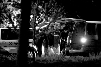 前天下午6點,在學校西側的小樹林內,學生家長和同學發現了兩具尸體。當晚,樹林旁的路邊停了十余輛警車,多名警察手持電筒、牽引著警犬在樹林內勘察,并陸續從現場提取相關證據帶離現場。由于現場太暗,警方還調來一輛照明警車。昨天零點50分左右,兩具尸體被運離現場。