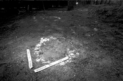 昨天上午在事發現場,警方勘察時撒的石灰粉清晰可見,一些物證袋封存條遺留在地上。在圍墻附近東西走向的灌木叢中,記者看到一處新翻的土堆,土堆上有兩處血跡。