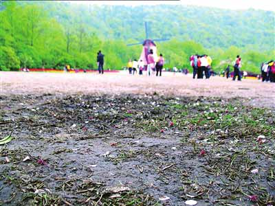 杭州市園林文物局花港管理處辦公室主任馮剛說,按太子灣的規(guī)模,人數(shù)超過1.1萬人次就要啟動應(yīng)急預(yù)案,但清明節(jié)3天游客數(shù)量超過20萬人次,70%是外地游客。為防止意外,疏散人群,公園只能把觀賞草坪開放。后果是一半草坪被損,成片草坪被踩成黃泥地,游客為了拍照,踩踏、搖落的觀賞花不計(jì)其數(shù)。